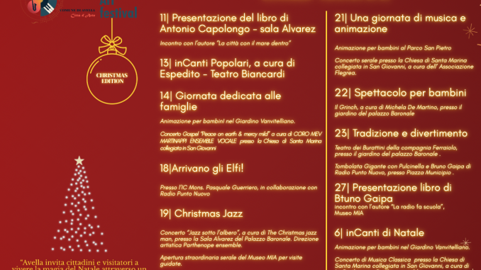 L’Amministrazione Comunale di Avella presenta l’edizione natalizia dell’Avella Art Festival, un cartellone di eventi che intreccia arte, musica, cultura, archeologia e tradizioni locali, con l’obiettivo di valorizzare il patrimonio storico e identitario della cittadina durante il periodo delle festività.