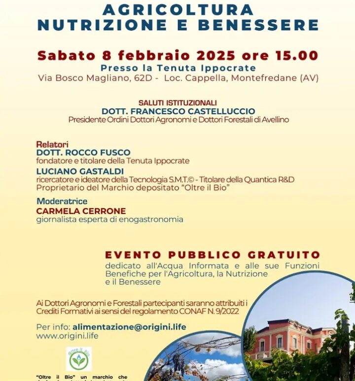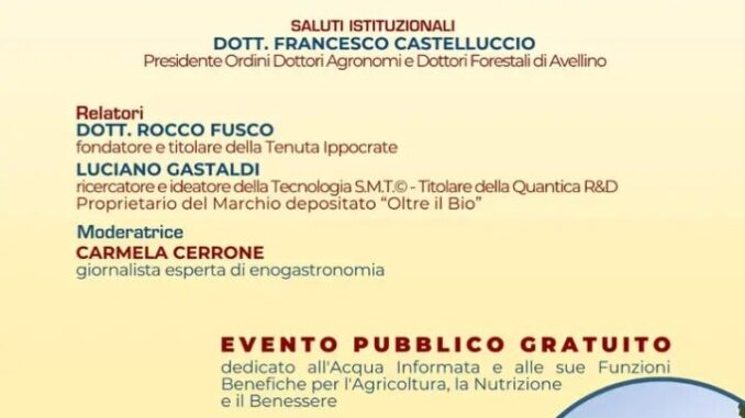 L’evento patrocinato dall’Ordine dei Dottori Agronomi e Dottori Forestali della provincia di Avellino sarà un confronto con il mondo scientifico e della ricerca sulla tecnologia sopramolecolare applicata all’agricoltura.