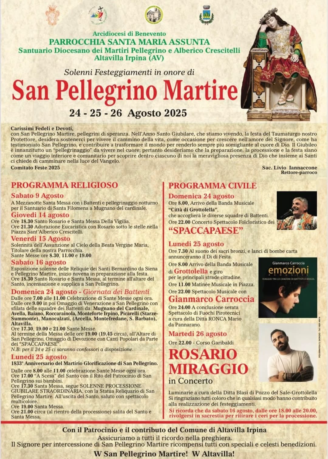 La comunità di Altavilla Irpina si prepara a vivere i solenni festeggiamenti in onore di San Pellegrino Martire, appuntamento di fede e tradizione fissato dal 24 al 26 agosto. Accanto al programma religioso, un ricco calendario di eventi civili animerà le strade e le piazze del centro irpino.