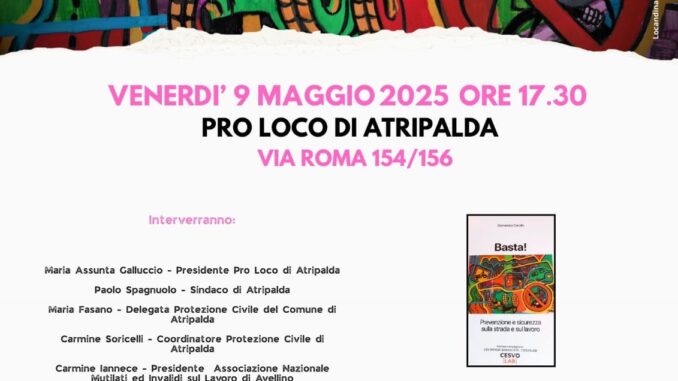 Venerdì 9 maggio 2025, alle ore 17.30, presso la sede della Pro Loco di Atripalda in via Roma 154/156, si terrà un’importante iniziativa dedicata ai temi della prevenzione e sicurezza sulla strada e sul lavoro. L’evento, organizzato in attesa del 108° Giro d’Italia, unisce arte e riflessione pubblica per sensibilizzare la cittadinanza su questioni cruciali per la salute e l’incolumità di tutti.