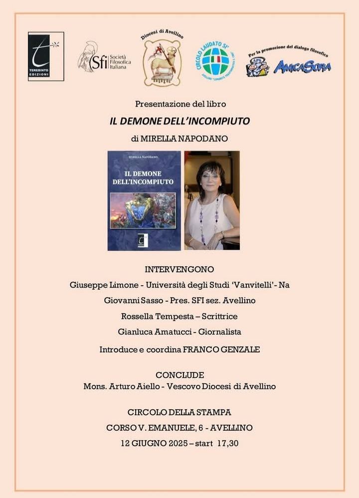 Giovedì 12 giugno 2025, alle ore 17:30, il Circolo della Stampa di Avellino ospiterà la presentazione del nuovo libro di Mirella Napodano, Il demone dell’incompiuto. Un’opera intensa e polifonica, in cui filosofia, arte, letteratura e riflessione civile si fondono in un unico respiro narrativo e saggistico.