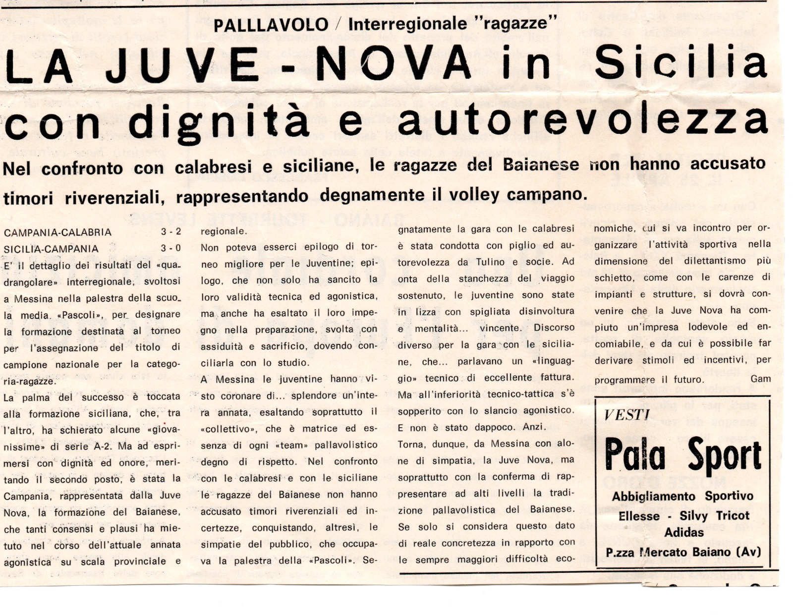 La Primavera Volley costituisce uno dei migliori esempi di tali meritorie associazioni, non soltanto per gli straordinari successi sportivi, ma anche per la forza e costanza dimostrata nell’essere ancora viva e attiva a distanza di 40 anni dalla costituzione. In genere la vita media delle associazioni è molto più breve: gli entusiasmi possono esaurirsi con il tramonto della generazione protagonista e il sodalizio creato si spegne. Ma c’è un altro valore di cui il movimento di pallavolo femminile può essere orgoglioso: aver compreso che la visione unitaria del nostro territorio costituisce una potenzialità da sfruttare per la sua crescita non soltanto sportiva, ma anche civile, culturale ed economica. Riunire le forze è un valore aggiunto che dovrebbe essere un obiettivo di tutta la nostra area che, purtroppo, a distanza di tanti anni, è ancora colpevolmente ignorato dalla nostra classe dirigente per un’angusta e personale visione della realtà. Concentrare le energie su progetti condivisi è un modo per moltiplicare le forze. L’esempio concreto fu offerto da illuminati dirigenti agli inizi degli anni 80 con la costituzione della JUVENOVA, nata dalla fusione di tre società: pol. Vecchione, Baiano, Royal Avella e pall. Sperone. I successi arrivarono subito con la partecipazione al campionato di C2 e con la vittoria ai campionati giovanili provinciali (Juniores) e regionali (categoria ragazze). Le finali nazionali di Messina del 1983 furono il coronamento di questa lungimirante strategia vincente.