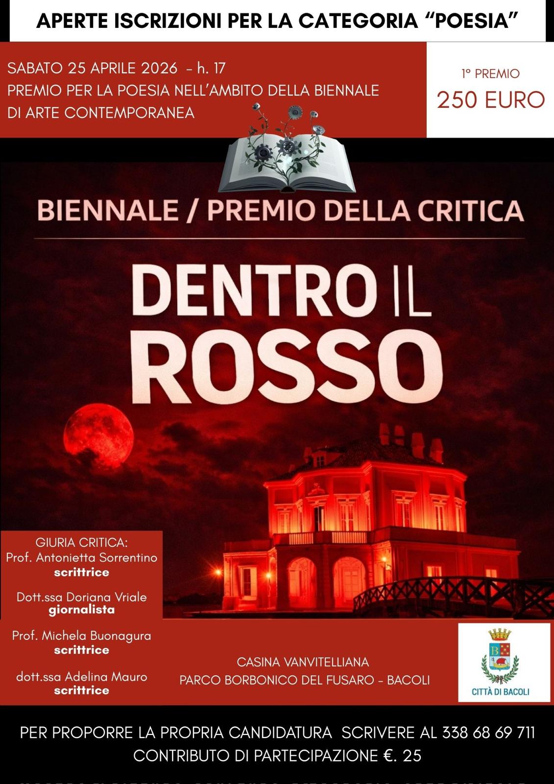 Il giorno 24 aprile nella sontuosa cornice della Casina Vanvitelliana di Bacoli sarà inaugurata la Biennale Internazionale di Arte Contemporanea denominata “Dentro il rosso”, con il patrocinio del Comune di Bacoli. L’artista Doriana Vriale, Presidente dell’Associazione Studio 5 Progetto Creativo, ha proposto un percorso artistico capace di individuare il significato profondo del colore rosso. Oltre 160 partecipanti dall’Italia e dall’estero , tra cui Stati Uniti, Spagna, Inghilterra, porteranno opere a loro libera interpretazione del senso del colore rosso, sotto forma di quadri, sculture, installazioni, fotografie, arti grafiche, video art. Alla mostra saranno presenti anche artisti che hanno vinto la precedente edizione tra cui lo scultore Bogdan Ionut Scinteie (n.d.r.) La mostra sarà aperta dal giorno 24 aprile fino al 3 maggio e nell’ultimo giorno vedrà la preziosa presenza dello storico e critico d’arte internazionale Giorgio Gregorio Grasso, per premiare il vincitore della rassegna. Nella giornata del 25 pomeriggio invece, ci sarà la premiazione dei Poeti vincitori del premio internazionale di poesia “Dentro il rosso” nella sua prima edizione. La commissione che nominerà i vincitori è costituita dalla poetessa scrittrice prof. Michela Buonagura, la dott. Doriana Vriale, la prof. Adelina Mauro e la giornalista cantante prof. Antonietta Sorrentino. L’evento sarà una fusione tra arte, letteratura, creando un arco di collegamento con la storia ed il paesaggio del territorio ed è anche un richiamo per la valorizzazione dello stesso con un’ esperienza sensoriale, emotiva, visiva davvero suggestiva.