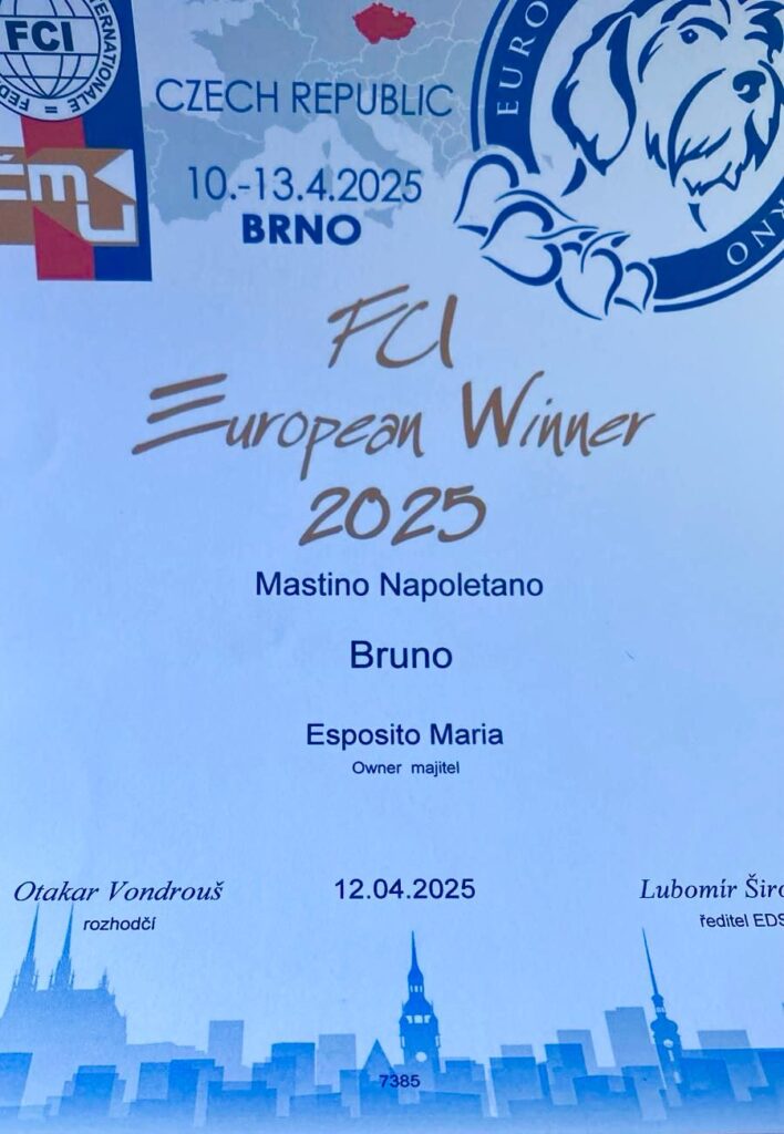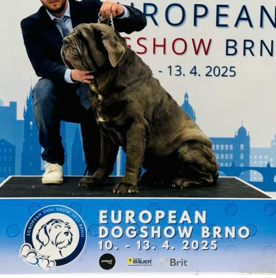 BRUNO, splendido esemplare di mastino napoletano di tre anni, si è distinto tra una selezione di cani di razza tutti di eccellenti qualità morfologiche, conquistando il titolo di European Winner 2025 Campione Europeo di bellezza imponendosi anche come Best of breed migliore di razza.