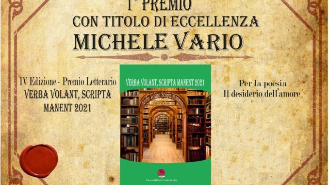 Lo scrittore Michele Vario ha vinto il Primo Premio con titolo di Eccellenza della IV Edizione del Premio Letterario Internazionale “Verba Volant, Scripta Manent 2021”. Il professore si è aggiudicato il prestigioso Premio con titolo di Eccellenza, superando i 682 partecipanti, autori italiani e stranieri, con la poesia “Il desiderio dell’amore”. Le parole d’amore utilizzate dal poeta indicano una sola direzione: la porta del cuore. Una poesia che dona emozioni nell’animo umano, i cui versi sfiorano il profondo del cuore.