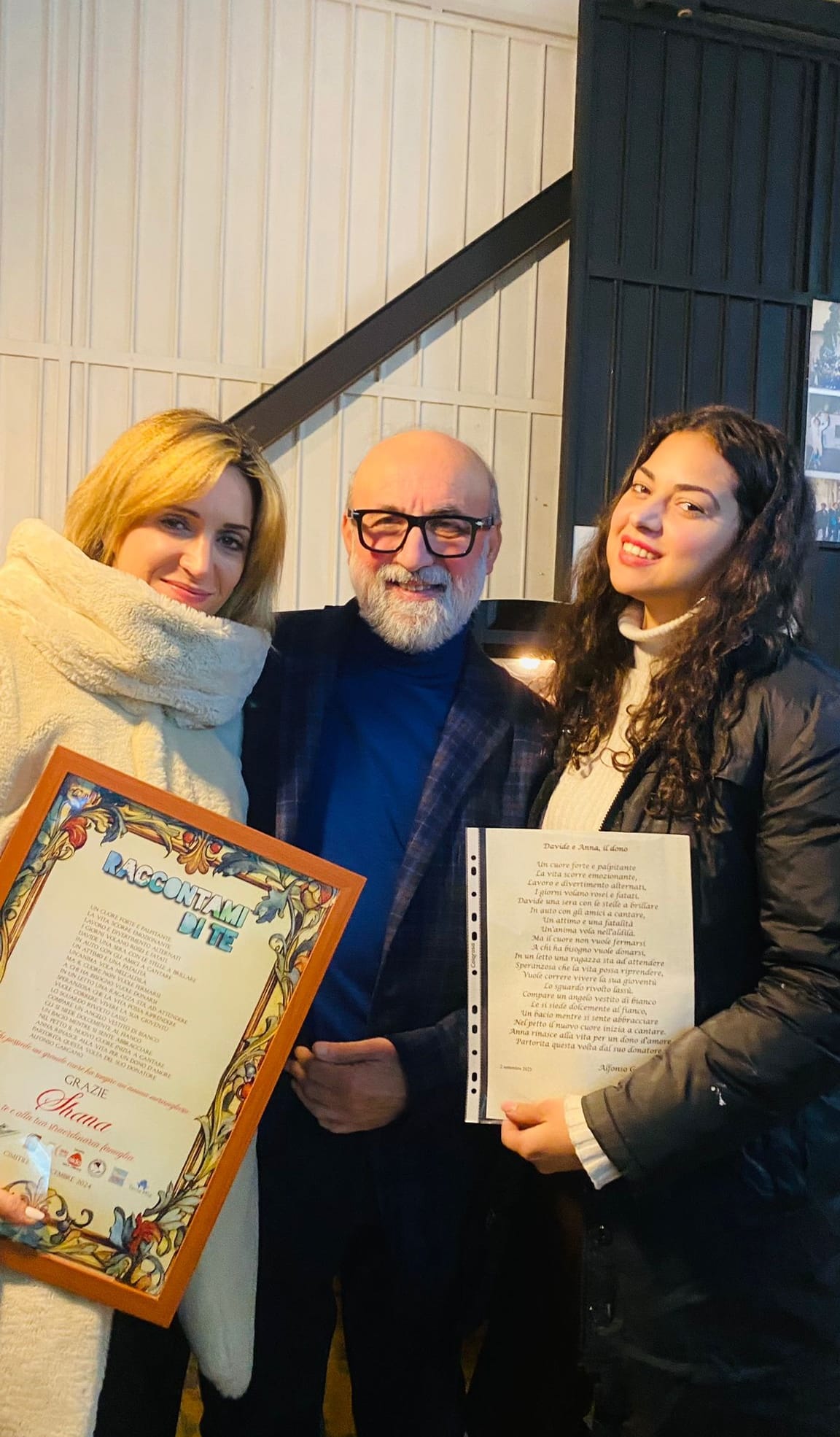 Con la presentazione di un libro che io definirei una lettera d’amore di una sorella al proprio fratello che è andato via troppo presto ma che grazie al suo immenso altruismo e amore per la vita una parte di lui vive ancora. Dopo aver parlato della storia di Davide, morto a soli 20 anni per un incidente stradale e grazie all’altruismo della sua meravigliosa famiglia che ha acconsentito alla donazione degli organi, oggi lui continua a vivere in altre persone. Il momento più forte ed emozionante della serata è stato sicuramente quando è stata invitata a presentarsi una ragazza fino a poco prima seduta tra gli ospiti e tutti hanno potuto conoscere una delle persone che ha ricevuto uno degli organi di Davide , la bellissima Anna che oggi vive grazie al cuore donato da Davide .