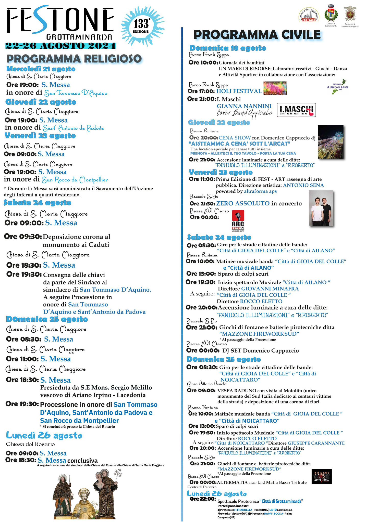 «Ci vediamo domani sera “sotto le arcate” per l’inizio ufficiale del Festone – è l’invito del Sindaco Marcantonio Spera – È sempre un momento emozionante per me, per noi grottesi. Il periodo storico non è dei migliori ma abbiamo tutti diritto a momenti di svago, di allegria, di condivisione di musica, spettacolo, buon cibo e poi ci sono i momenti religiosi che ci aiutano anche a riflettere e a migliorarci. Non dimentichiamo che tutto è in onore dei Santi Patroni, Sant’Antonio, San Rocco e San Tommaso. Dunque l’invito è alla cittadinanza a godere appieno di questi festeggiamenti civili e religiosi organizzati con estremo impegno dai ragazzi del Comitato, della Parrocchia, con il supporto costante della nostra squadra amministrativa. Un particolare benvenuto a quanti sono arrivati o ritornati da fuori per viverli con noi. Buon Festone!».