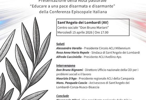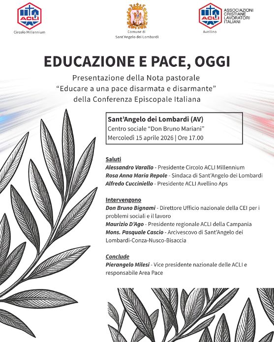 Le ACLI irpine si sono date una nuova occasione per contribuire ad una nuova narrazione della pace, organizzando -col fondamentale supporto del locale Circolo Acli Millennium ed il patrocinio dell’Amministrazione comunale- un incontro pubblico che si terrà mercoledì 15 aprile, alle ore 17.00, presso il Centro sociale “Don Bruno Mariani” di Sant’Angelo dei Lombardi.
