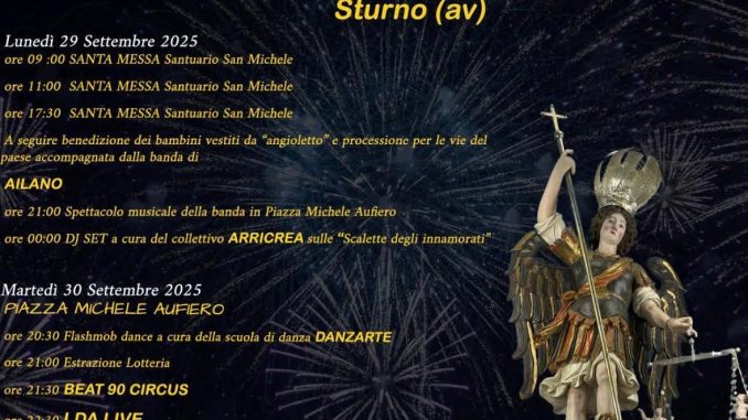 La comunità di Sturno si prepara a vivere con grande partecipazione le festività in onore di San Michele Arcangelo, patrono del paese, in programma lunedì 29 e martedì 30 settembre 2025. Due giornate intense che uniranno momenti di spiritualità, processioni, musica e spettacoli, nel segno della devozione e della tradizione popolare.