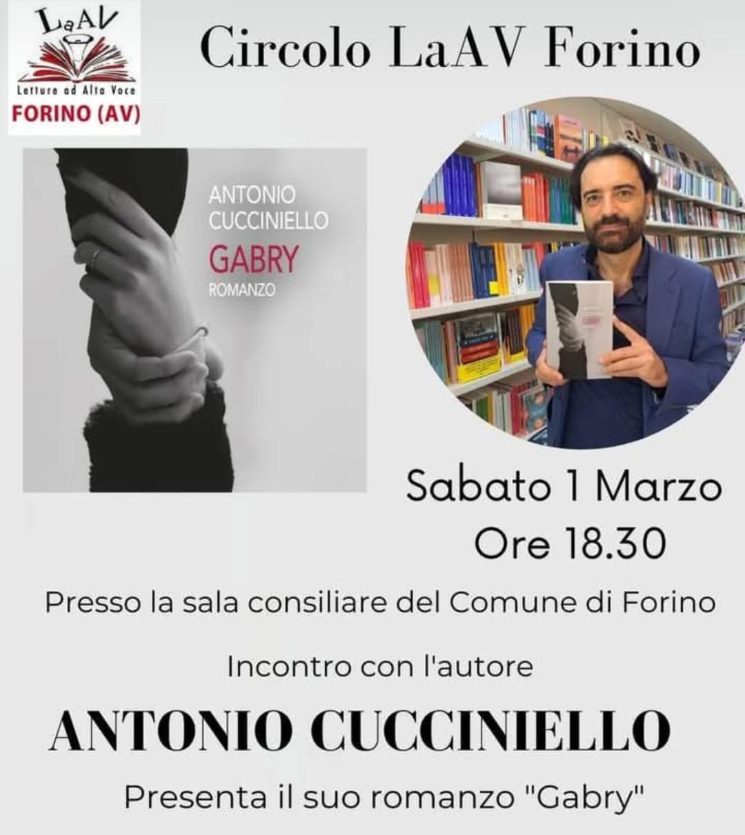 Sabato 1 Marzo nella cittadina dei Sette Colli per un evento organizzato dal Circolo LaAV Forino ci sarà il noto scrittore Irpino Antonio Cucciniello , il quale alle ore 18.30 presso la Sala Consiliare ” Parisi”, presenterà il suo nuovo romanzo ” Gabry” . Dialogheranno con l’ autore la Dottoressa Maria Rosaria Califano Direttrice dell’ SBA dell’ Unisa, nonché la Dottoressa Rosalia Spolverino Coordinatrice Circolo LaAV Forino i volontari dello stesso circolo , nonché Mattia Carmine Rega che accompagnerà l’ evento con qualche suo importante brano musicale.