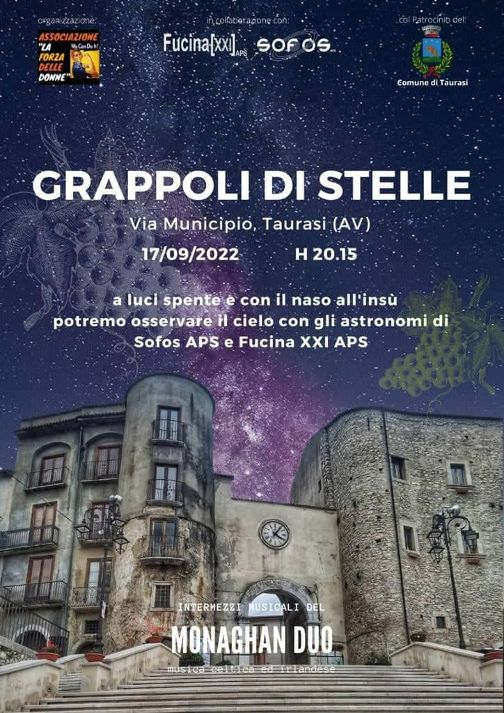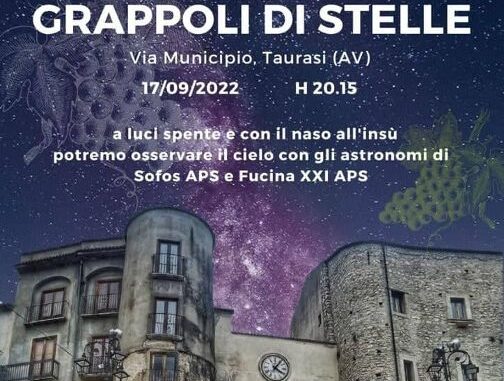 “Grappoli di stelle”, questo l’eloquente titolo della serata-evento che si svolgerà in piazza Municipio sabato 17 settembre, con inizio alle ore 20.15, su iniziativa dell’Associazione “La Forza delle Donne”, presieduta da Anna Addonizio, con il patrocinio del Comune di Taurasi, in collaborazione con l’Associazione di promozione sociale “Fucina [XXI] APS” e dell’Associazione per la divulgazione delle scienze “SOFOS APS”, entrambe con sede a Bologna.