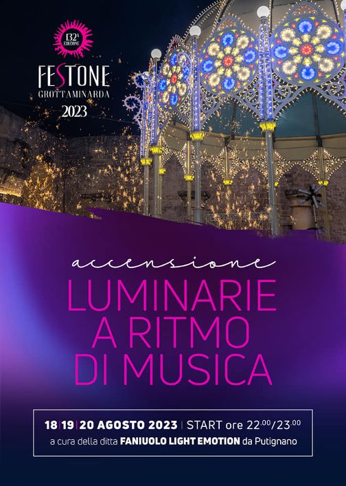 Dalle ore 22.00 alle 23.00 poi “Luci e Musica”, spettacolo di accensione delle luminarie a ritmo di musica a cura della ditta Faniuolo Light Emotion di Putignano.