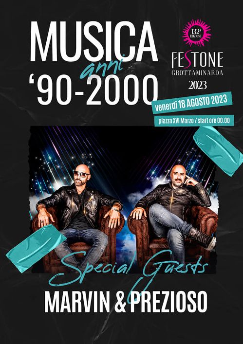 Alle 23.00, in Piazza XVI Marzo, parte il Dj Set con Domenico Cappuccio & Raffaele Bruno e prosegue dalla mezzanotte con “La Più Bella Musica Degli Anni 90”, Special Guest Marvin & Prezioso.