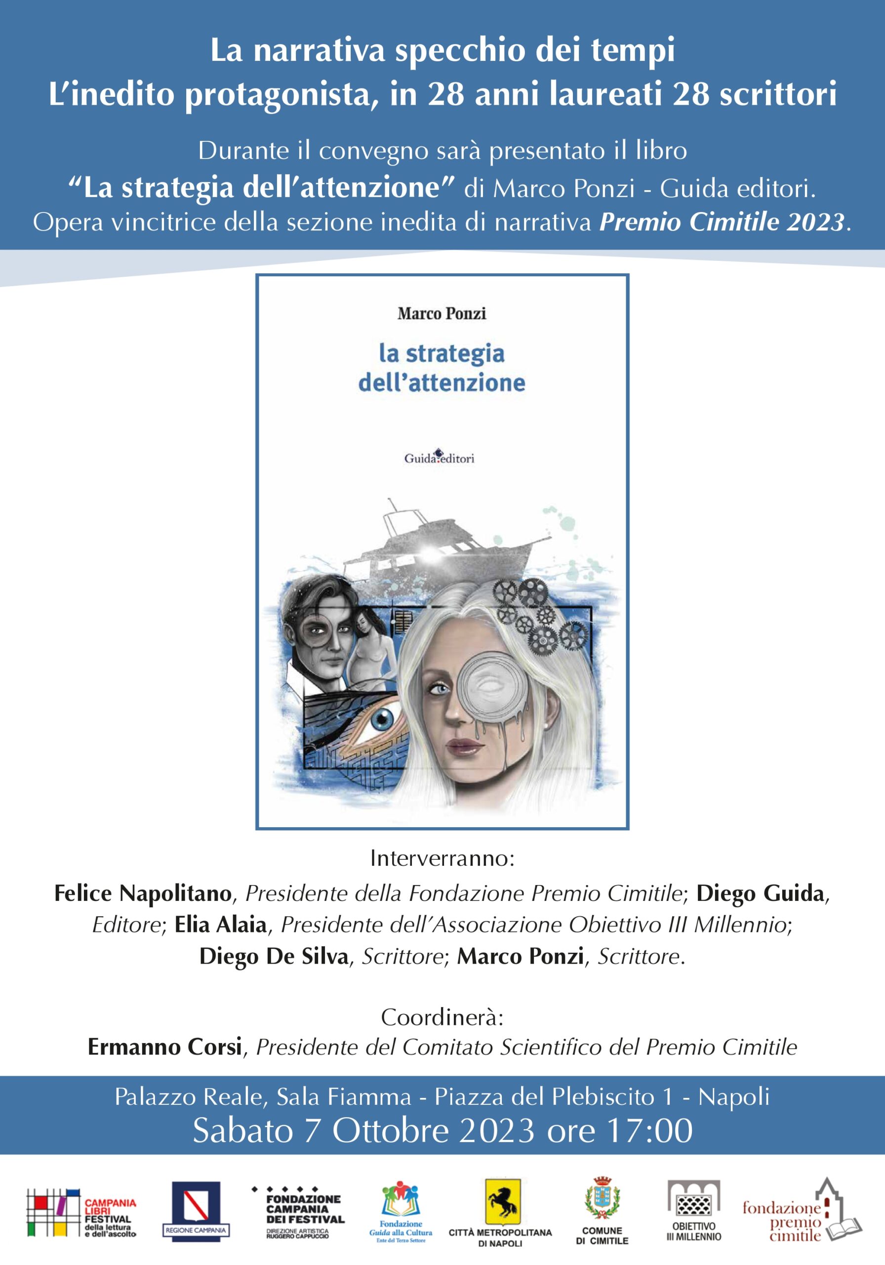 Si terrà Sabato 7 Ottobre alle ore 17.00 presso il Palazzo Reale, Sala Fiamma, Piazza del Plebiscito 1, Napoli, nell’ambito della rassegna Campania Libri Festival della lettura e dell’ascolto, il convegno “La narrativa specchio dei tempi. L’inedito protagonista, in 28 anni laureati 28 scrittori”, durante il quale sarà presentato il romanzo “La strategia dell’attenzione” di Marco Ponzi – Guida Editori