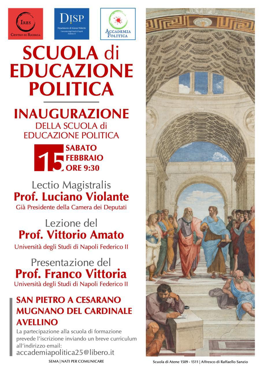 Sabato 15 febbraio, a partire dalle ore 9:30, si terrà l’inaugurazione della Scuola di Educazione Politica presso la splendida cornice di San Pietro a Cesarano, Mugnano del Cardinale, in provincia di Avellino. L’evento, organizzato con il contributo di IRES – Centro di Ricerca, del Dipartimento di Scienze Politiche dell’Università di Napoli Federico II (DISP) e dell’Accademia Politica, si propone di offrire uno spazio formativo dedicato alla riflessione e all’approfondimento sui temi della politica e della società.