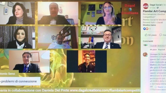A proclamare i vincitori, nell’ultimo incontro on line web tv con la regia della Del Prete, coadiuvata dall’opera dalla giornalista Sabrina Abbrunzo noto volto e firma di Capri Event, Donna Fashion News e Report Campania, nonché socia simpatizzante AMIRA, che ha moderato i lavori, è stata una competente giuria. A comporre la Giuria, il Presidente Nazionale dell’Amira Valerio Beltrami, il Gran Cancelliere Nazionale Amira Claudio Recchia, il Presidente Urcc Campania (Unione Regionale Cuochi Campani) Luigi Vitiello, la Presidente Ais Campania (Associazione Italiana Sommelier) Nicoletta Gargiulo e Diego Paura giornalista, responsabile della Redazione Spettacoli del quotidiano “Roma”. I giurati si son detti felici di aver potuto seguire e giudicare dei veri e grandi professionisti del Flambè ed inoltre di aver potuto avere l’opportunità di discutere fra loro per trovare un punto di incontro che potesse dar loro modo di esprimere il nome del vincitore, magari solo per qualche piccolo particolare apprezzabile più di altri, dato che il lavoro svolto dai concorrenti nella presentazione del oloro piatto alla “Lampada” e dell’abbinamento vino, è stato fatto da tutti in modo veramente eccellente.