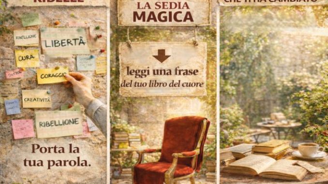 Al centro del cortile, la Sedia Magica offrirà a chi vorrà la possibilità di leggere una breve frase dal libro che più ha segnato la propria esperienza di lettore, trasformando un ricordo personale in un momento di ascolto pubblico.
