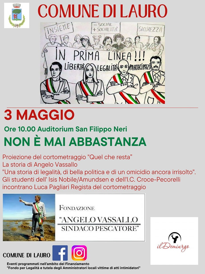 Il progetto, ideato dal Comune di Lauro in collaborazione con la Fondazione Angelo Vassallo – Sindaco Pescatore e finanziato dal “Fondo per la Legalità e tutela degli Amministratori locali vittime di intimidazioni”, si propone di far luce su tematiche cruciali legate alla legalità e alla responsabilità civica. E il viaggio inizia con un docufilm particolarmente toccante: “Quel Che Resta”.