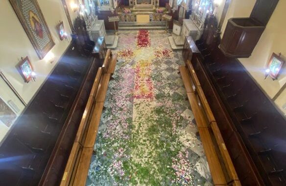 In occasione del Corpus Domini 2025, la Chiesa della Madonna del Carmine si è trasformata in un luogo di profonda spiritualità e intensa bellezza grazie all’opera del maestro Fernando Mangone, autore di quella che è stata definita l’Infiorata della Pace. Quest’anno, nel contesto dell’Anno Giubilare della Speranza, Mangone ha scelto di rappresentare un tema di immensa forza e significato: il Sacrificio di Cristo. L’infiorata, realizzata con una meticolosa composizione di petali di fiori, occupa l’intera navata centrale fino all’altare maggiore, diventando così un tappeto vivo e colorato che accompagna i fedeli in un cammino di fede e riflessione. “Ho voluto che questa immagine fosse semplice, quasi essenziale – racconta Mangone – ma al contempo carica di un messaggio profondo di speranza e pace. La Croce, il Calice e l’Ostia rappresentano il cuore della nostra fede cristiana, la passione e la redenzione di Cristo, la sua presenza reale tra noi nell’Eucaristia.”