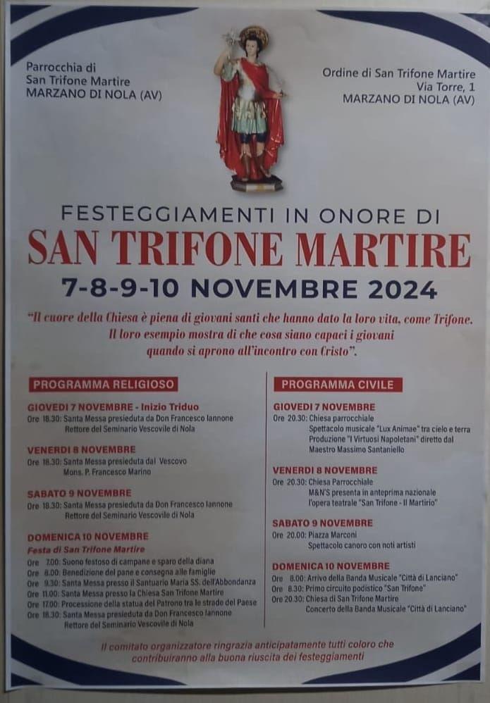 Dal 7 al 10 novembre 2024, Marzano di Nola (AV) ospiterà una serie di celebrazioni religiose e civili in onore di San Trifone Martire, una figura venerata e amata nella comunità locale. La manifestazione è organizzata dalla Parrocchia di San Trifone Martire e dall’Ordine di San Trifone Martire, e prevede un ricco programma che unisce momenti di preghiera a spettacoli e iniziative per tutta la famiglia.
