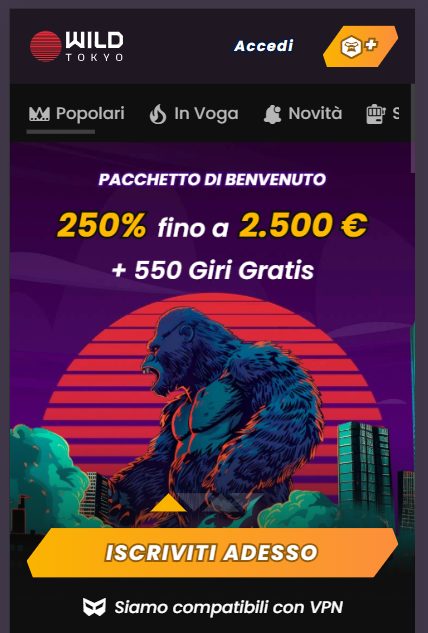 Wild Tokyo è una piattaforma recente ma ambiziosa, con una collezione di oltre 8.000 giochi tra slot moderne, tavoli da gioco, live casino e tornei periodici. Offre bonus di benvenuto multipli e promozioni regolari come cashback settimanale e reload bonus. Nonostante operi sotto licenza Curacao e non direttamente Gibilterra, la sua attenzione alla user experience su mobile e alle transazioni rapide la rende un’opzione interessante per chi cerca casinò online moderni e ricchi di funzionalità.