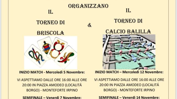 MONTEFORTE IRPINO (AV) – L’autunno si accende di passione e convivialità grazie a due iniziative che uniscono gioco, tradizione e spirito di comunità. L’Associazione Polivalente Socio-Culturale “Fenestrelle” ODV e il Comitato “Le Sette Contrade” hanno infatti organizzato due eventi imperdibili: il Torneo di Briscola e il Torneo di Calcio Balilla, che animeranno le prossime settimane nel territorio di Monteforte Irpino e Avellino.