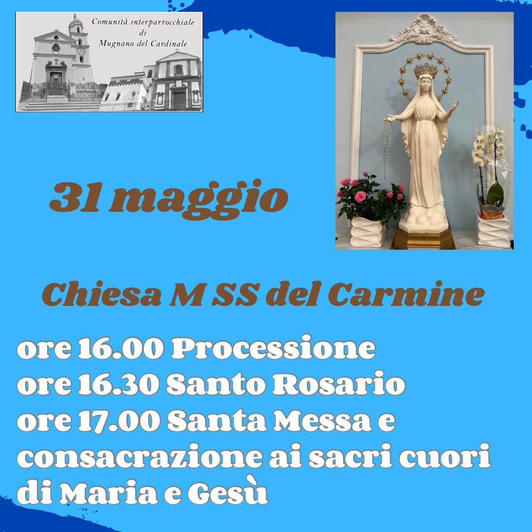 Domani, sabato 31 maggio, la comunità interparrocchiale di Mugnano del Cardinale vivrà un momento di intensa spiritualità nella suggestiva cornice della Chiesa di Maria Santissima del Carmine. Un’occasione preziosa per rinnovare la fede e affidarsi con devozione all’amore misericordioso del Cuore di Gesù e a quello materno del Cuore Immacolato di Maria.