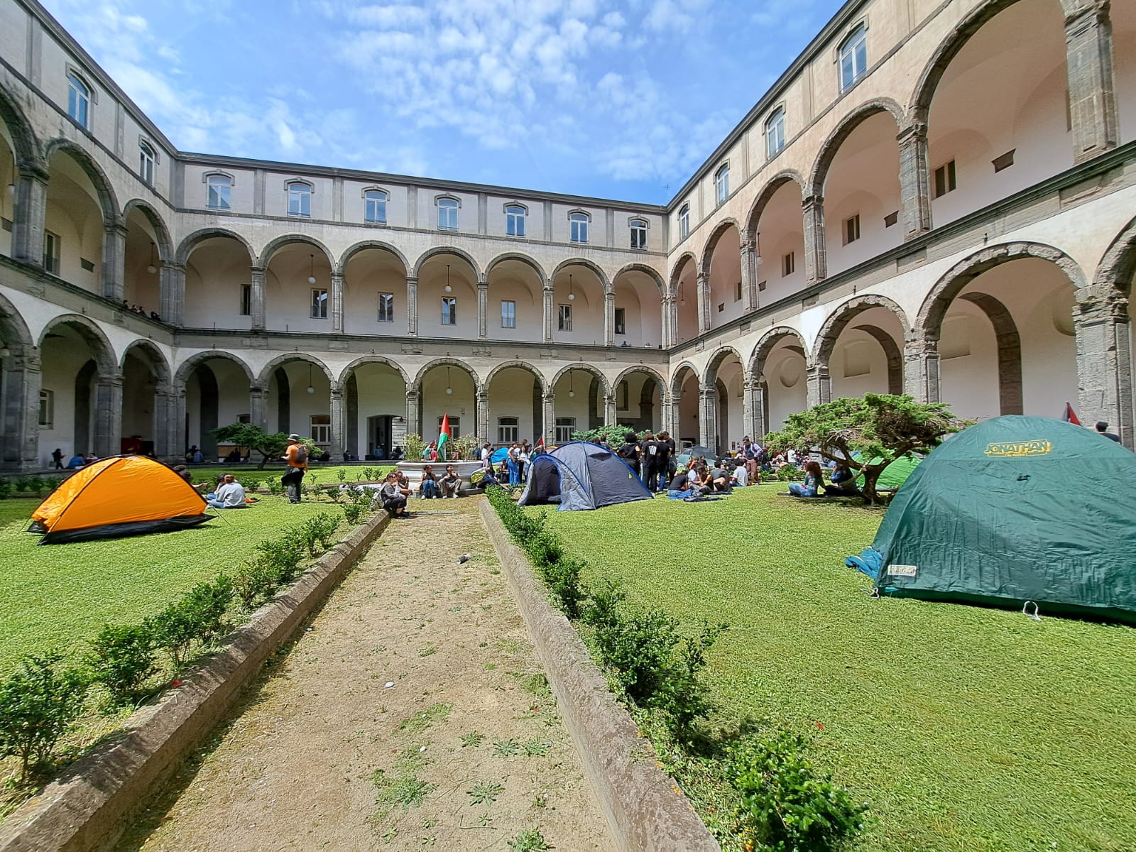 Nella mattinata del 7 maggio diverse decine di studenti hanno occupato il cortile della facoltà di lettere e filosofia dell’Università degli Studi di Napoli “Federico II” in solidarietà con la Palestina. Un lungo striscione recante la scritta “Stop al Genocidio” e diverse tende hanno trasformato il chiostro dell’edificio di Via Porta di Massa in una delle sedi della protesta universitaria globale, sulla scia di quanto già avvenuto alla Columbia University di New York e alla Sciences Po di Parigi. L’ obiettivo dei membri della “Rete studentesca per la Palestina” è ottenere le dimissioni del rettore Matteo Lorito dal comitato scientifico della fondazione MedOr- promossa dall’azienda leader della difesa europea Leonardo- nonché la cessazione di tutti i rapporti di collaborazione con le università israeliane. L’ occupazione, comunicano i manifestanti, è destinata a procedere ad oltranza fino a quando tali richieste non verranno soddisfatte. Gli studenti, inoltre, accusano il massimo dirigente dell’ateneo napoletano di aver disatteso diverse promesse e di essersi mostrato scarsamente disponibile al dialogo.