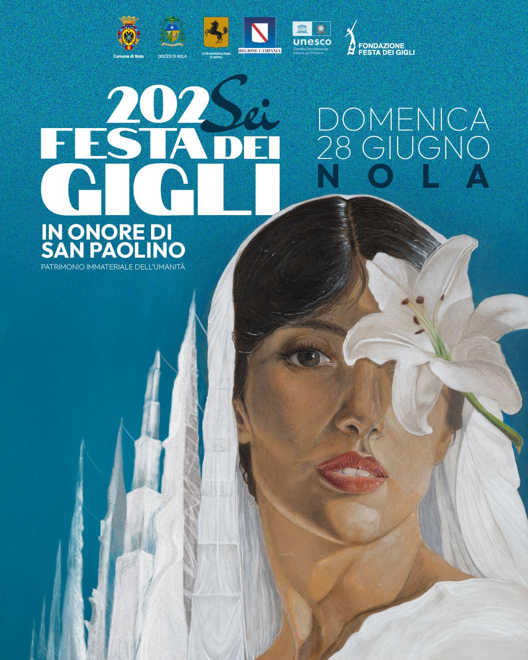 Il manifesto si basa su un dipinto realizzato da Marco Pescosolido, svelato ed esposto al pubblico in occasione dell’evento: un ritratto di Therasia, moglie di San Paolino, che con il suo velo cinge e “protegge” le macchine da Festa, rivendicando il ruolo da protagonista che la donna ha da sempre avuto nella Festa Eterna.