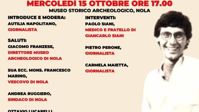 NOLA (NA) — Quarant’anni dopo la tragica uccisione di Giancarlo Siani, Nola rende omaggio al giovane cronista de Il Mattino con l’incontro dal titolo “#SIANI40 – La verità non muore mai!”, in programma mercoledì 15 ottobre alle ore 17:00 presso il Museo Storico Archeologico.