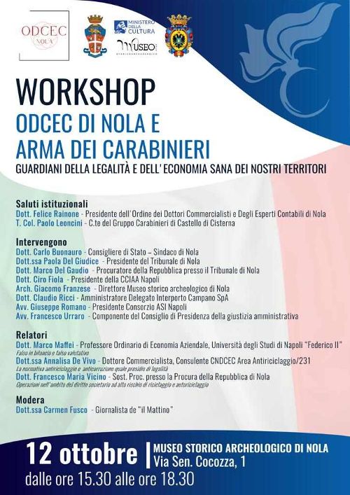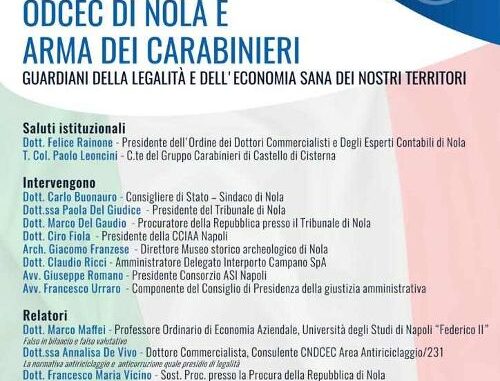 Nola. Un workshop che vede insieme Odcec (Ordine dei Dottori Commercialisti e degli Esperti Contabili) di Nola e i carabinieri, in virtù della convenzione stipulata tra il CNDCEC e l’Arma, si terrà giovedì 12 ottobre dalle ore 15.30. Appuntamento al museo archeologico di Nola (via senatore Cocozza 1 Nola), tema del convegno “Odcec di Nola e Arma dei carabinieri, guardiani della legalità e dell’economia sana dei nostri territori”. Parteciperanno esponenti di primo piano dell’autorità giudiziaria, delle forze dell’Ordine, delle professioni, dell’Impresa e della pubblica amministrazione, i quali, con approccio improntato al confronto ed alla multidisciplinarità, avranno la possibilità di discutere dell’argomento soffermandosi su tematiche tecniche quali: Antiriciclaggio e Autoriciclaggio, Misure di Prevenzione Patrimoniali, Falso in Bilancio, Compliance e Normative Finanziarie, con un focus sulla promozione di comportamenti etici e conformi alla normativa di settore cogente. Nel dettaglio sono previsti i saluti istituzionali affidati a Felice Rainone – Presidente dell’Ordine dei Dottori Commercialisti e Degli Esperti Contabili di Nola e al tenente colonnello Paolo Leoncini – comandante del Gruppo carabinieri di Castello di Cisterna. Intervengono: Carlo Buonauro – Consigliere di Stato – sindaco di Nola Paola Del Giudice – Presidente del Tribunale di Nola, Marco Del Gaudio – Procuratore della Repubblica presso il Tribunale di Nola, Ciro Fiola – Presidente della CCIAA Napoli, Giacomo Franzese direttore del Museo storico archeologico di Nola, Claudio Ricci amministratore delegato Interporto Campano SpA Giuseppe Romano – Presidente Consorzio ASI Napoli, Francesco Urraro – componente del Consiglio di Presidenza della giustizia amministrativa. Relatori, invece, Marco Maffei – professore ordinario di Economia Aziendale, Università degli Studi di Napoli “Federico II” che porterà un intervento su “Falso in bilancio e falso valutativo”, Annalisa De Vivo – Dottore Commercialista, Consulente CNDCEC Area Antiriciclaggio/231 con “La normativa antiriciclaggio e anticorruzione quale presidio di legalità”, infine Francesco Maria Vicino – Sostituto procuratore della Procura della Repubblica di Nola con “Operazioni nell’ambito del diritto societario ad alto rischio di riciclaggio e autoriciclaggio”, modera Carmen Fusco giornalista de “il Mattino”.