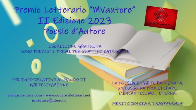 Da qualche giorno è stato pubblicato il bando per il Premio Letterario di Poesia “MVautore” – Seconda Edizione 2023. Dopo il grande successo per la Prima Edizione 2022, dal 20 Gennaio 2023 al 30 Marzo 2023 ritorna il Premio Letterario di Poesia “MVautore”. Ci saranno delle importanti novità e tanti premi – spiega il prof. Michele Vario, Presidente e organizzatore del concorso di Poesia. La partecipazione è gratuita e aperta a tutti, quattro le categorie premiate e ulteriori riconoscimenti per i classificati in graduatoria di merito. Inoltre, saranno poi selezionate per la pubblicazione del libro speciale, un’antologia che rappresenterà una forma letteraria di poesie d’autore, le opere che risulteranno idonee rispetto al regolamento del Premio di Poesie d’Autore. La selezione delle opere sarà gestita da una giuria tecnica che osserverà le forme note per l’assoluta imparzialità. Verranno rispettati i valori che valorizzeranno l’eccellenza, indipendentemente dalla provenienza dei partecipanti – continua il Responsabile del concorso. Il bando e il modulo di iscrizione sono disponibili sul sito web www.mvautore.com nell’area dedicata al Premio Letterario e sul prestigioso portale www.concorsiletterari.net tra i siti più visitati sul web. Meritocrazia e trasparenza saranno le basi per una giusta competizione, la poesia tiene viva la mente, resta l’arte raffinata, un lusso da proliferare, l’incantesimo… eterna! – conclude il prof. Michele Vario.