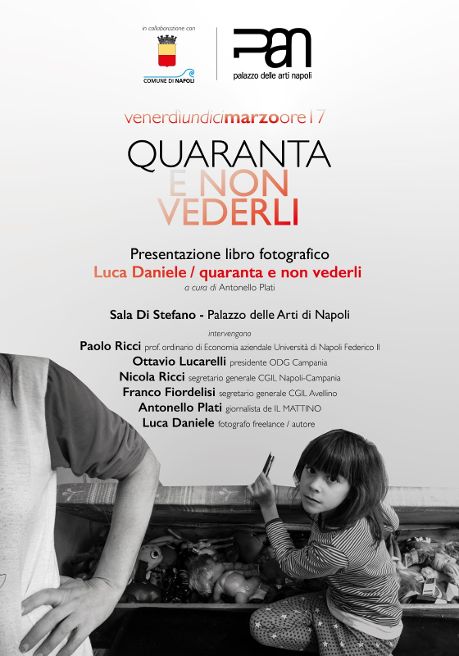 a mostra Quaranta e non vederli sarà in esposizione al Pan di Napoli dall’11 al 21 marzo 2022. Nella giornata inaugurale, l’ 11 marzo, alle ore 17 nella sala Di Stefano del Palazzo delle arti, sarà presentato il catalogo che raccoglie le 40 foto esposte (e altre 20 inedite). Con gli autori, Luca Daniele e Antonello Plati, ne discutono Paolo Ricci, professore ordinario di Economia aziendale all’Università di Napoli Federico II, Ottavio Lucarelli, presidente dell’Ordine dei giornalisti della Campania, Nicola Ricci, segretario generale Cgil Napoli-Campania, e Franco Fiordellisi, segretario generale Cgil Avellino. A seguire, alle 19 nel foyer del Palazzo delle arti, è in programma l’inaugurazione della mostra.