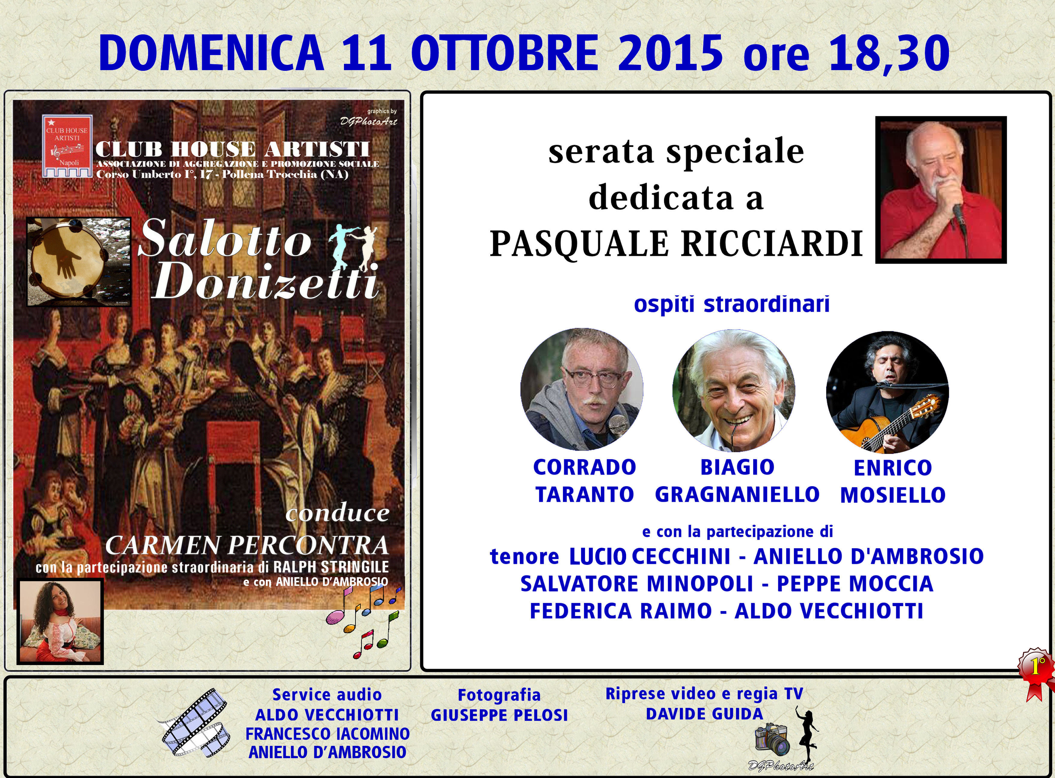 Domenica 11 ottobre alle 18,30 inizia al Club House Artisti la nuova stagione culturale del Salotto Donizetti. L’evento culturale di musica e poesia, diretto e condotto da Carmen Percontra e che da anni è ospitato dalla struttura stabile di Pollena Trocchia, riapre con un ricordo amaro, un saluto a chi è stato direttore e amico di tanti artisti, il dottor Pasquale Ricciardi, scomparso improvvisamente per un tragico incidente stradale lo scorso giugno, proprio il giorno successivo alla serata finale della scorsa stagione del Salotto.
