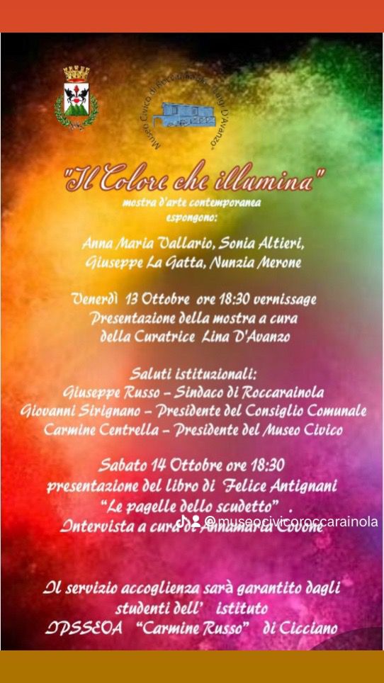 Il Museo Civico “Luigi D’Avanzo” a Roccarainola, Napoli, è pronto ad aprire le porte a un evento straordinario che celebra l’arte contemporanea e la letteratura locale. Con il patrocinio del Comune di Roccarainola, il museo accoglierà la mostra “Il Colore che Illumina”, arricchita dalla presentazione del libro di Felice Antignani, “Le pagelle dello scudetto”.