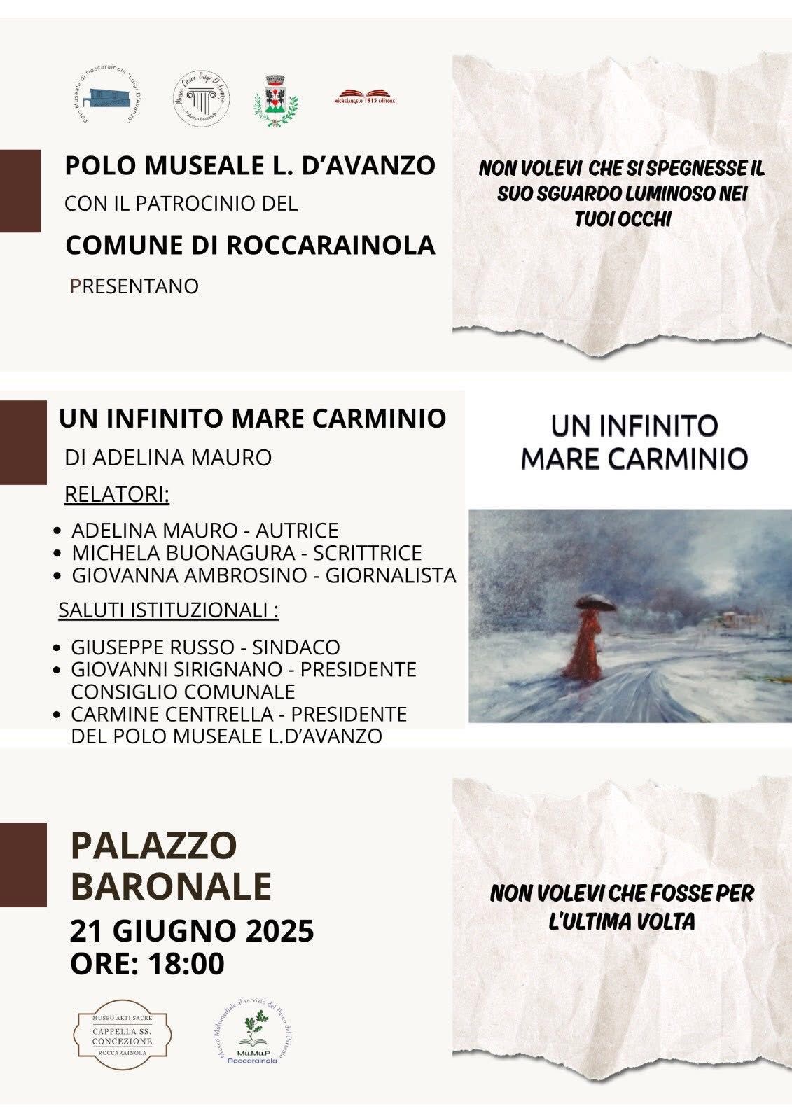 Alcune storie nascono dal profondo e sono capaci di attraversare il cuore di chi le pensa e di arrivare dritte a chi le legge. Una di queste storie è “Un infinito mare carminio”, il libro di Adelina Mauro, che sarà presentato in un incontro speciale sabato 21 giugno 2025 alle ore 18:00, presso il Palazzo Baronale di Roccarainola. Un momento di condivisione, di riflessione e di bellezza.