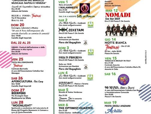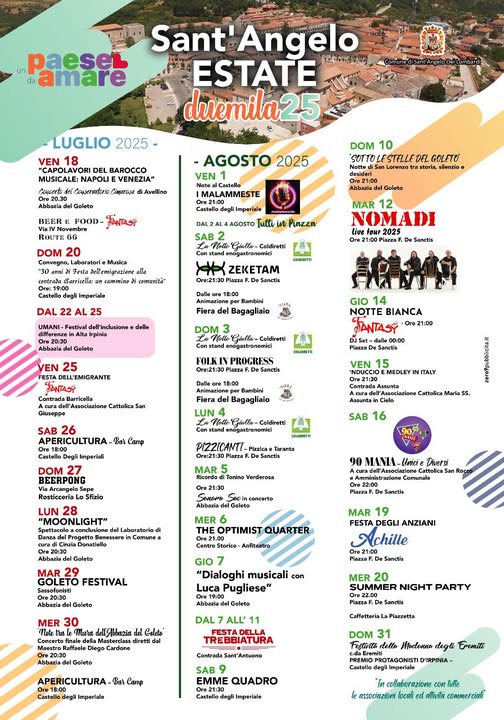 Il 12 agosto, piazza De Sanctis, il concerto dei Nomadi, che tornano a Sant’Angelo dei Lombardi dopo il successo dell’anno scorso. Giovedì 14 agosto la Notte Bianca in piazza De Sanctis con Fantasy Show in concerto e Dj Set. A Ferragosto festa in contrada Assunta con ‘Nduccio e Medley in Italy. Altri tre appuntamenti in piazza De Sanctis. Sabato 16, 90 Mania – Unici e Diversi. Il 19 la Festa degli Anziani con Achille e il 20 Summer Night Party. Domenica 31 agosto si chiude con la Festività della Madonna degli Eremiti nell’omonima contrada e il Premio “Protagonisti d’Irpinia” al Castello degli Imperiale. Il cartellone di agosto è organizzato dall’Amministrazione Comunale di Sant’Angelo dei Lombardi in collaborazione con le associazioni locali e le attività commerciali. Tutti gli eventi sono ad ingresso gratuito.