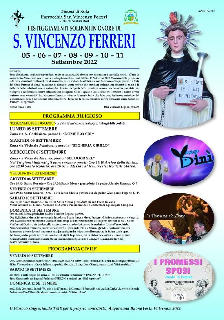 A Scafati, con l’inizio del mese di settembre hanno inizio i festeggiamenti in onore di San Vincenzo Ferreri santo venerato nella parrocchia di omonima di Scafati. In allegato i festeggiamenti religiosi e civili comunicati dal parroco Don Vincenzo Ragone.