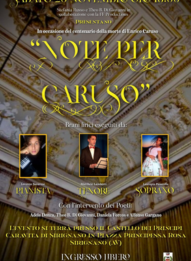 La FF Production & Management è lieta di presentarvi, in occasione del centenario della morte di Caruso, l’evento “Note per Caruso” che si terrà il 20 novembre alle ore 18:00 presso il Castello dei Principi di Caravita a Sirignano (AV). Una serata dedicata all’Arte della Lirica e della Poesia con la partecipazione dei seguenti artisti: