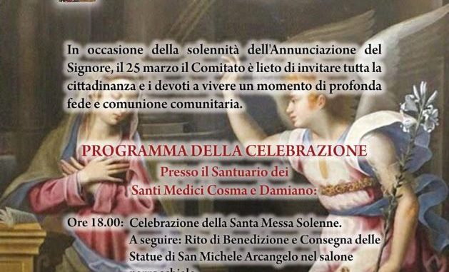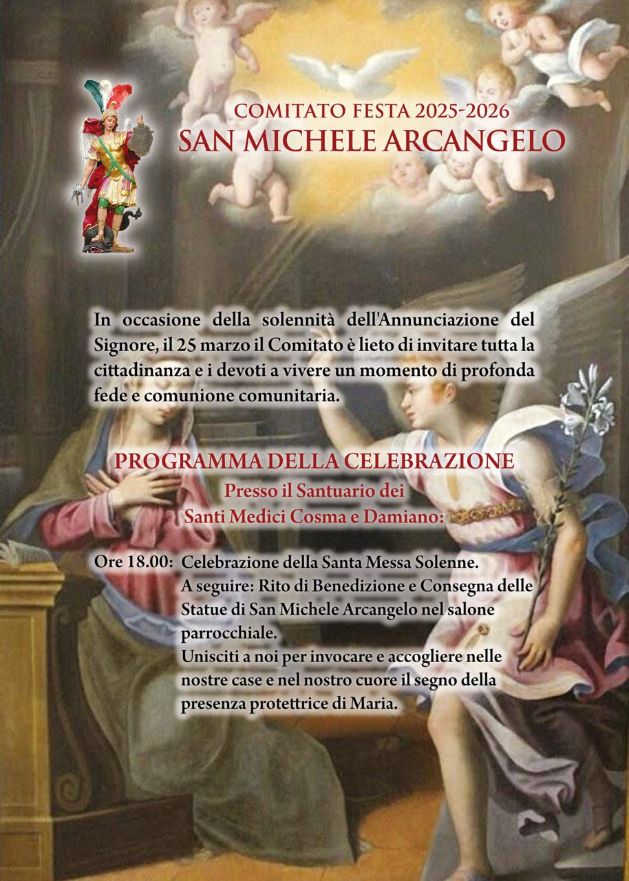 Il programma prenderà il via alle ore 18.00 con la Celebrazione della Santa Messa Solenne. Al centro della riflessione, il legame tra l’evento dell’Annunciazione – definita nel testo di preghiera diffuso per l’occasione come “l’aurora della redenzione” – e la figura dell’arcangelo Michele, al quale il comitato ha dedicato le iniziative dell’anno.