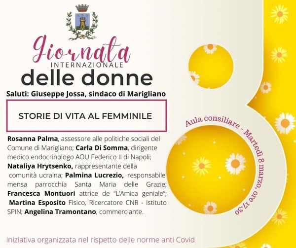 Storie di vita al femminile: nell’aula consiliare del Comune di Marigliano un momento di confronto in occasione della giornata internazionale della donna. Esperienze personali e professionali a confronto ma anche momento di riflessione comune sulla guerra in Ucraina vista con gli occhi delle donne. Dopo i saluti del sindaco di Marigliano Peppe Jossa interverrano: Rosanna Palma, assessore alle politiche sociali del Comune di Marigliano; Carla Di Somma, dirigente medico endocrinologo AOU Federico II di Napoli; Nataliya Hrytsenko, rappresentante della comunità ucraina; Palmina Lucrezio, responsabile mensa della parrocchia Santa Maria delle Grazie; Francesca Montuori attrice de “L’Amica geniale”; Martina Esposito Fisico, Ricercatore CNR – Istituto SPIN; Angelina Tramontano, commerciante.