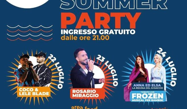 (Venerdì 22 luglio Coco e Lele Blade show; sabato 23 Rosario Miraggio in concerto e domenica 24 luglio, tributo a Frozen).