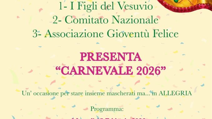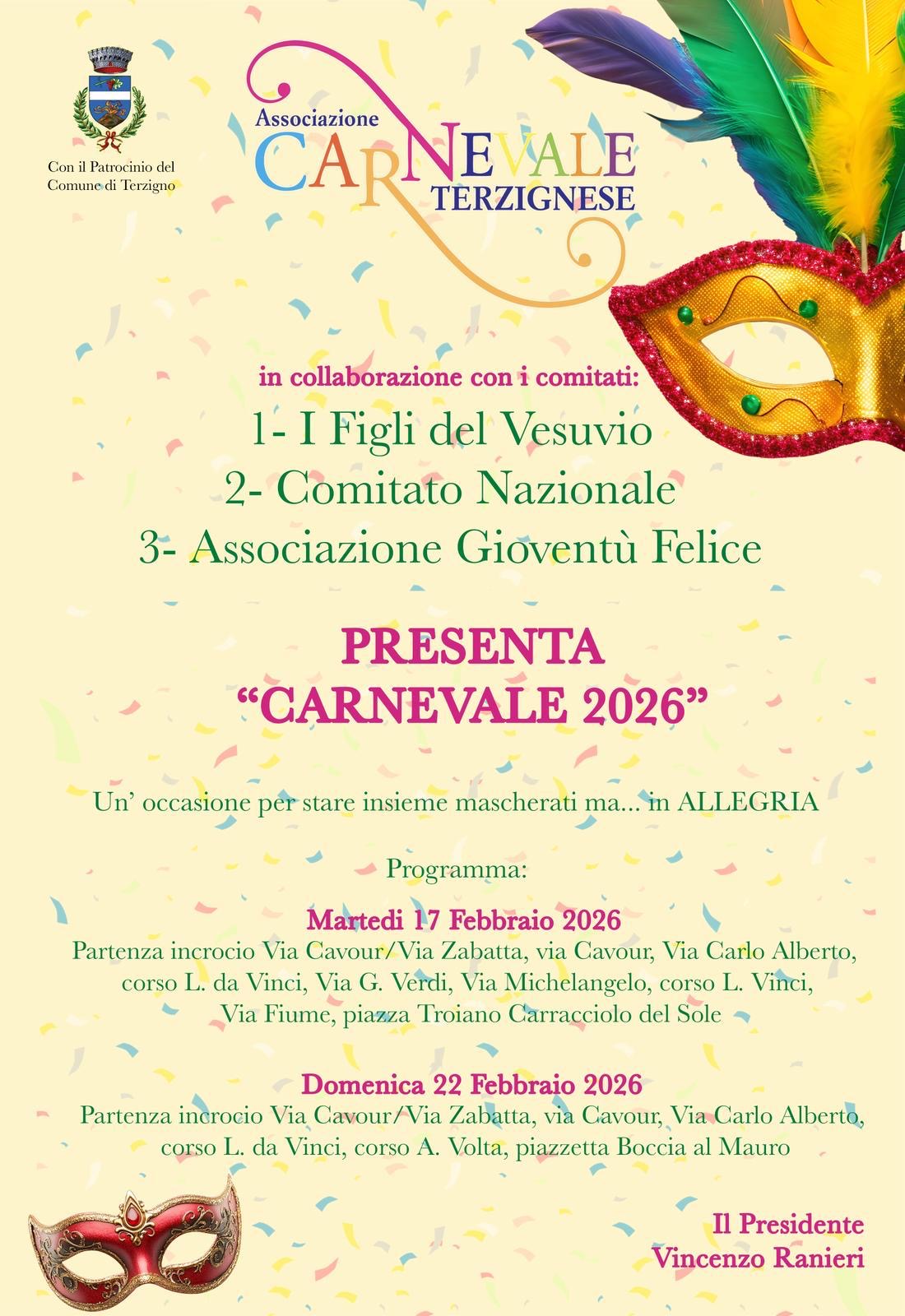 Terzigno si prepara a vivere giorni di festa, musica e condivisione con il Carnevale Terzignese 2026, un evento atteso che unisce tradizione popolare e spirito comunitario. L’iniziativa, promossa dall’Associazione Carnevale Terzignese con il patrocinio del Comune di Terzigno, vede la collaborazione dei comitati I Figli del Vesuvio, Comitato Nazionale e Associazione Gioventù Felice.