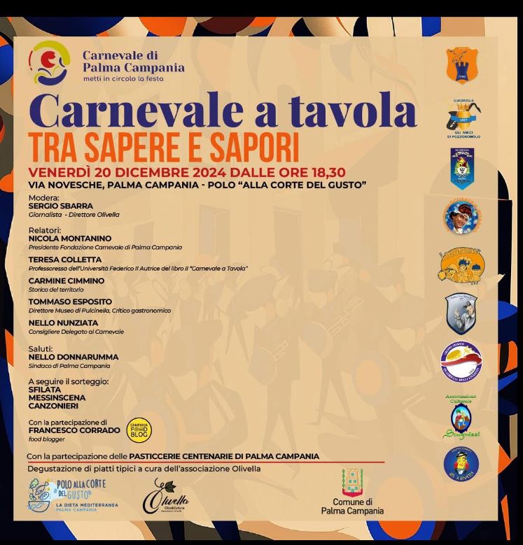 Il Carnevale di Palma Campania si siede a tavola e regala un evento speciale nella giornata di venerdì 20 dicembre. Alle ore 18:30, presso il Polo “Alla Corte del Gusto” di via Novesche è infatti stato organizzato il convegno Carnevale a Tavola, tra Saperi e Sapori, promosso dalla Fondazione Carnevale di Palma Campania.  A moderare i lavori il giornalista e avvocato “gourmet” Sergio Sbarra, direttore dell’associazione “Olivella”. Previsti i saluti istituzionali di Nello Donnarumma, sindaco di Palma Campania. Interverranno, in qualità di relatori: Nicola Montanino, presidente della Fondazione Carnevale di Palma Campania; Teresa Colletta professoressa dell’Università Federico II di Napoli e autrice del libro “Il Carnevale a Tavola”; Carmine Cimmino, storico del territorio; Tommaso Esposito, direttore del Museo di Pulcinella e critico gastronomico; Nello Nunziata, consigliere comunale con delega al Carnevale.