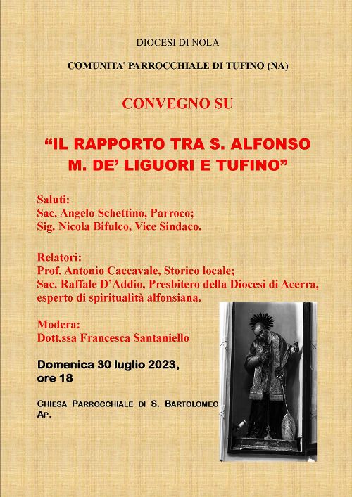 Il 30 luglio scorso, su iniziativa del parroco don Angelo Schettino, nella parrocchia di san Bartolomeo apostolo, si è tenuto un convegno sulla figura di sant’Alfonso Maria de’ Liguori e sui suoi rapporti con Tufino. Il vicesindaco, signor Nicola Bifulco, ha portato i saluti dell’Amministrazione comunale. Ha svolto le funzioni di moderatrice la dott.ssa Francesca Santaniello. Il professor Antonio Caccavale, storico locale, e il sacerdote Raffaele D’Addio, esperto di spiritualità alfonsiniana, hanno illustrato la figura del Santo.