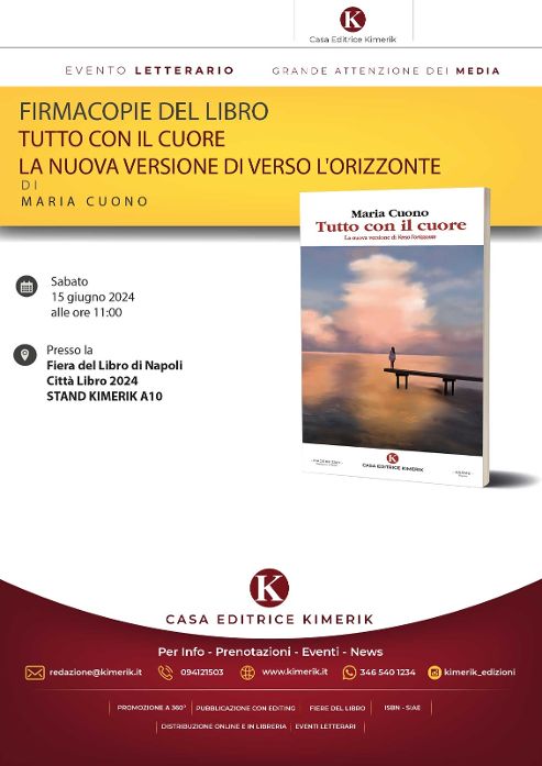 Sabato 15 giugno alle ore 11.00 la giornalista e scrittrice Maria Cuono sarà presente per il firmacopie del libro Tutto con il cuore. La nuova versione di Verso l’Orizzonte, edito dalla Casa Editrice Kimerik, presso la Fiera del Libro di Napoli, allo Stand Kimerik A10. La prefazione è a cura del soprano Olga De Maio.