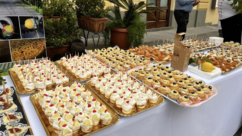 La storica Pasticceria “Fiorentino” ha offerto l’altro dessert, la mitica sfogliatella Santarosa, regina di dolcezza di questo territorio, tra il golfo di Sorrento e la Costa d’Amalfi, eccellenza tramandata dalle suore di clausura dell’omonimo Monastero a Conca dei Marini (SA). La signora Stella della storica Pasticceria Fiorentino, riservata e gentilissima mi ha concesso uno scatto fotografico insieme al marito ed al figlio Vincenzo nella sua bellissima pasticceria, dove l’impegno e la passione da sempre portano avanti l’eccellenza delle tradizioni santagatesi.