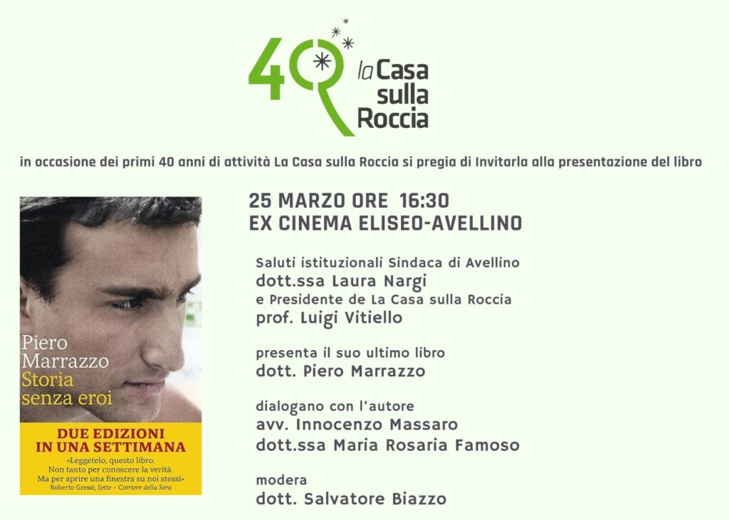 Casa sulla Roccia, nell’ambito degli eventi legati alla celebrazionedei primi quarant’anni di attività sul territorio di Avellino,presenta martedì 25 Marzo, alle ore 16.30, presso l’Ex-Cinema Eliseo di via Roma, il libro “Storia senza eroi” di Piero Marrazzo. Dialogheranno con l’autore l’avvocato Vincenzo Massaro e la dottoressa Maria Rosaria Famoso. L’incontro sarà moderato dal giornalista Salvatore Biazzo.