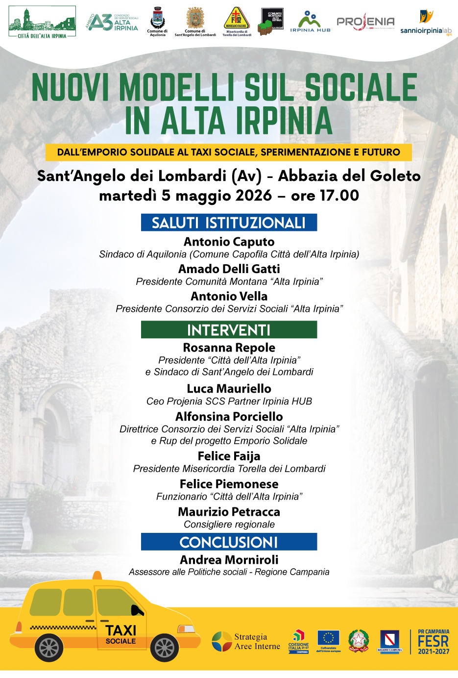 SANT’ANGELO DEI LOMBARDI (AV). Martedì 5 maggio 2026 si terrà il convegno “Nuovi modelli sul Sociale in Alta Irpinia”. Dall’emporio solidale al taxi sociale, passando per le altre nuove buone prassi del territorio altirpino, si discuterà delle recenti iniziative messe in campo dalla Città dell’Alta Irpinia e da altri enti pubblici e privati. L’appuntamento è previsto presso l’Abbazia del Goleto di Sant’Angelo dei Lombardi alle ore 17.00.