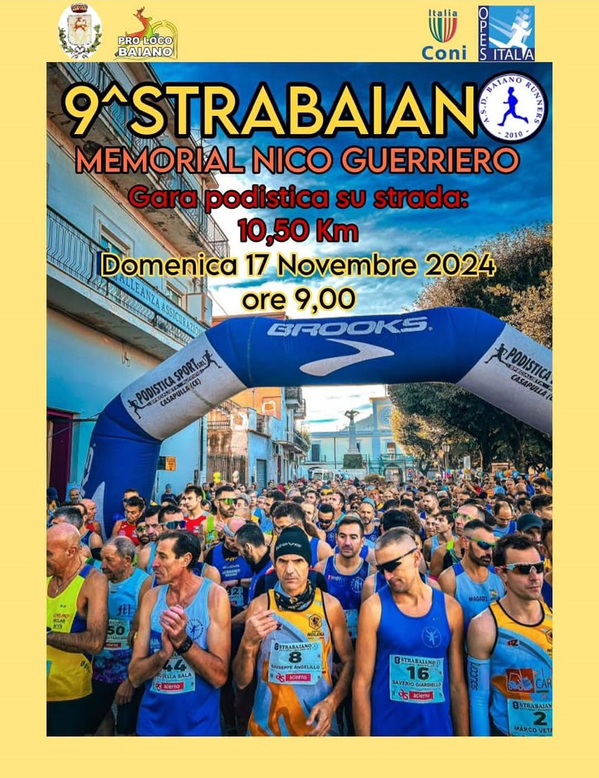 L’associazione sportiva “Baiano Runners”, con il patrocinio del Comune di Baiano e la collaborazione della Pro Loco di Baiano e di OPES Italia, organizza la 9ª edizione della Strabaiano, dedicata alla memoria di Nico Guerriero. La gara podistica su strada, che si terrà domenica 17 novembre 2024, copre un percorso di 10,5 km ed è aperta a tutti gli atleti maggiorenni tesserati con società sportive.